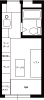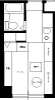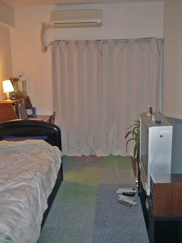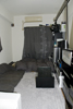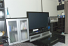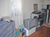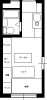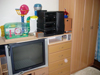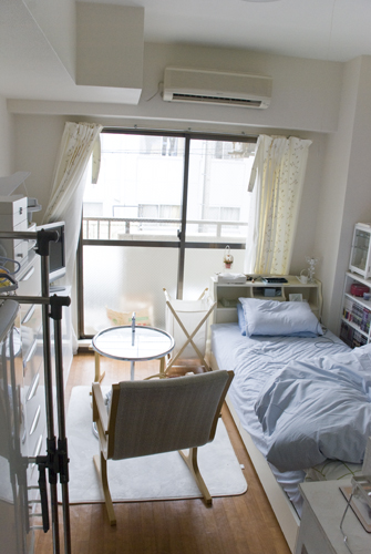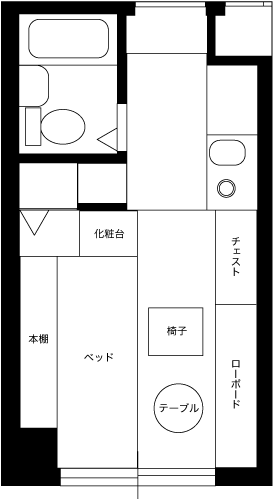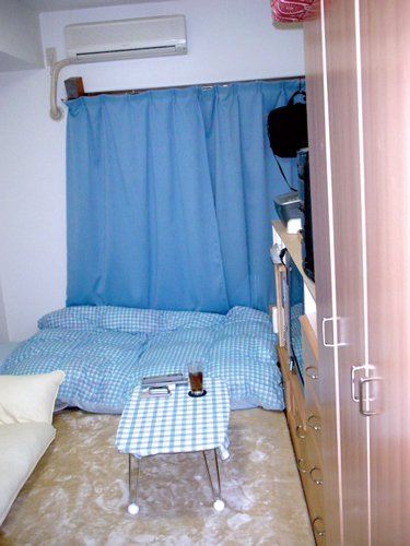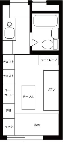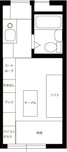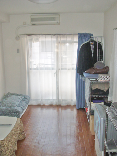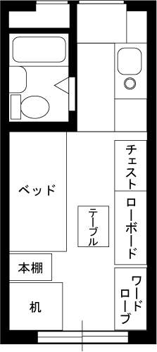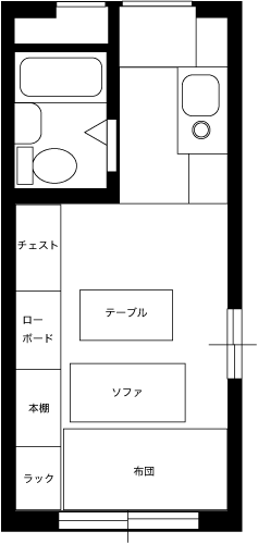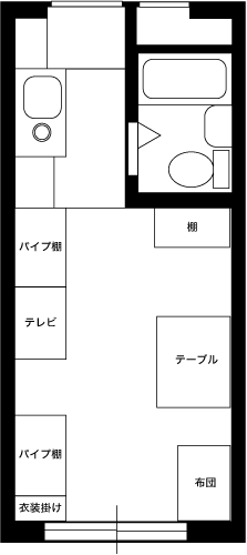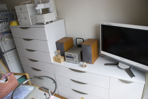 無駄な物を置かずAV機器メインに構成されたシンプルな部屋です。床にタイルカーペットを敷くことで部屋の雰囲気が変わっています。冷蔵庫置き場をワードローブ代わりに利用するのは良いアイディアです。台所下の収納が意外と大きいため,大きなゴミ箱も収納できます。
