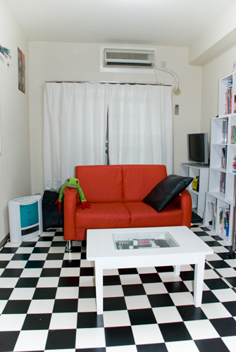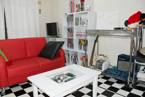 白黒チェックの床と赤いソファのコントラストが映える,まるで映画やプロモーションビデオのワンシーンとして出てきそうなお部屋です。ギターのネックが雰囲気を出しています。インテリア関係の本を読んで研究したり,好きなアーティストに触発されたりしたそうです。
