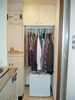 洋服を収納するのにタンスとワードローブ,ベッドの下に引き出し収納を使用しており,テレビ等もパイプ棚を使うことでラインの統一されたスッキリしたお部屋となっております。