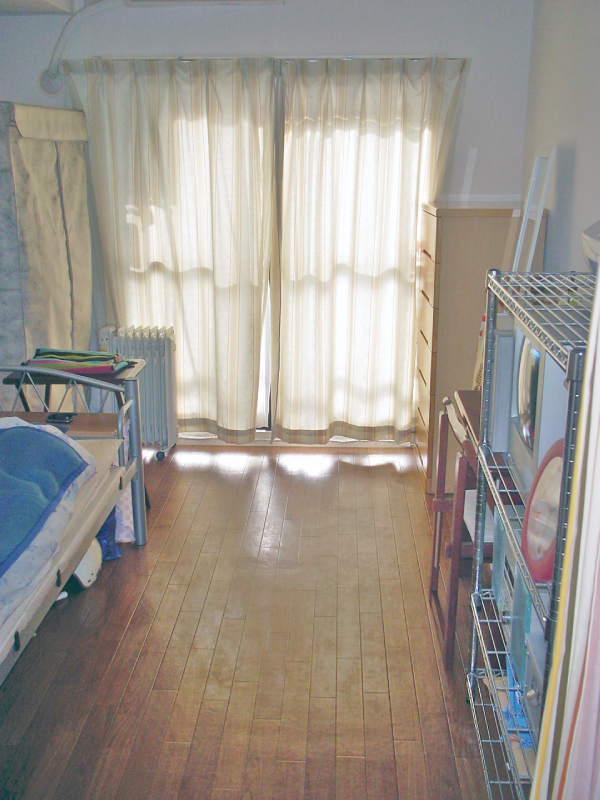大塚家具で購入した白い家具に白い液晶テレビ・白いカーテンと白を基調としたお部屋作りが清潔感漂う素敵な雰囲気のお部屋になりました。両側の壁面に収納を配置したことで収納スペースを大きく確保出来,それでいて生活空間も充分な広さとなっております。